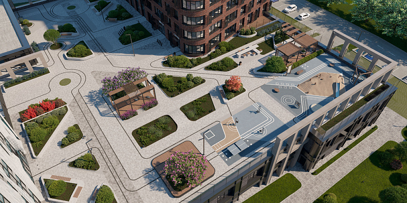 Современные силуэты домов комплекса создают гармоничное цельное пространство и формируют новый облик всего микрорайона. Архитектурную концепцию жилого комплекса мы разработали совместно с крупными архитектурными бюро OSA Group, г. Екатеринбург и MLA+, Нидерланды.