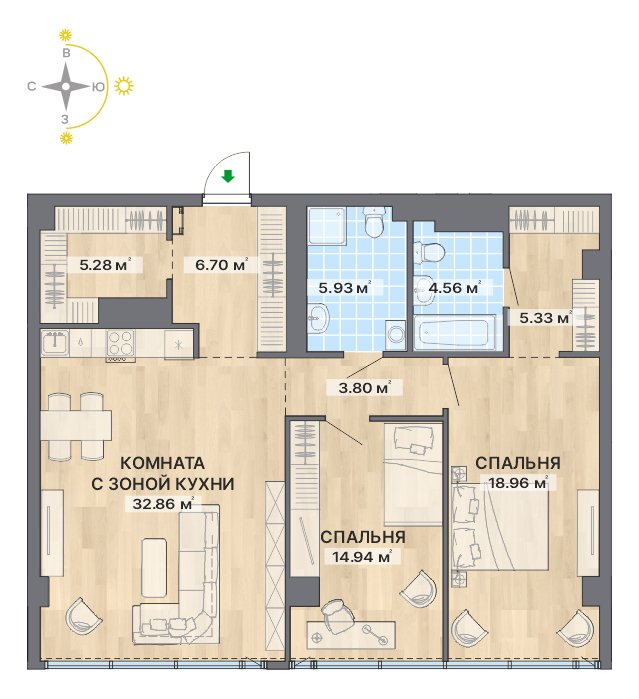 • мастер-спальня ≈ 18 м² с возможностью разместить гардероб,