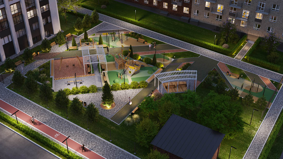 Двор Умных кварталов выполняется по принципу «двор без машин». Въезд во двор предусмотрен только для спецтехники по пешеходным тротуарам усиленной конструкции. Пешеходные тротуары отделены от проездов бордюрами и участками озеленения. Ландшафтный дизайн яркий и необычный. Во дворах будет чем заняться жителям всех возрастов!