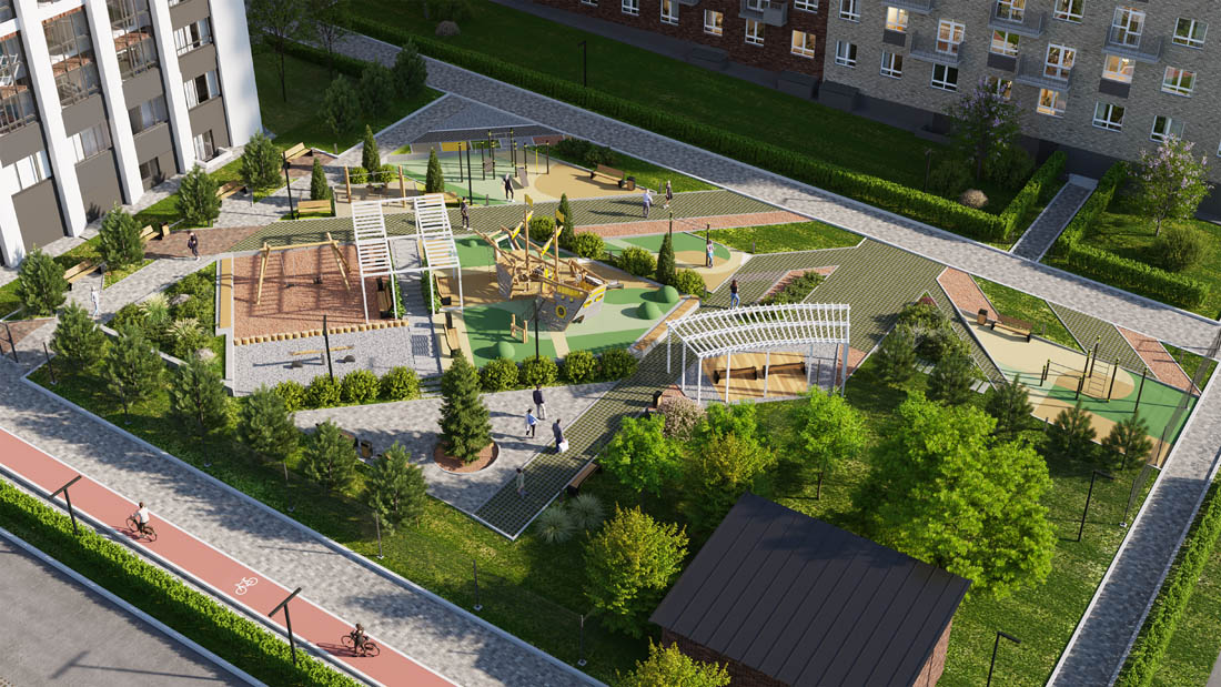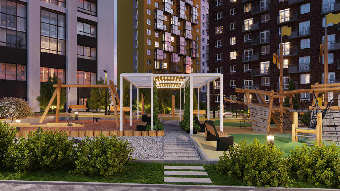 Двор Умных кварталов выполняется по принципу «двор без машин». Въезд во двор предусмотрен только для спецтехники по пешеходным тротуарам усиленной конструкции. Пешеходные тротуары отделены от проездов бордюрами и участками озеленения. Ландшафтный дизайн яркий и необычный. Во дворах будет чем заняться жителям всех возрастов!