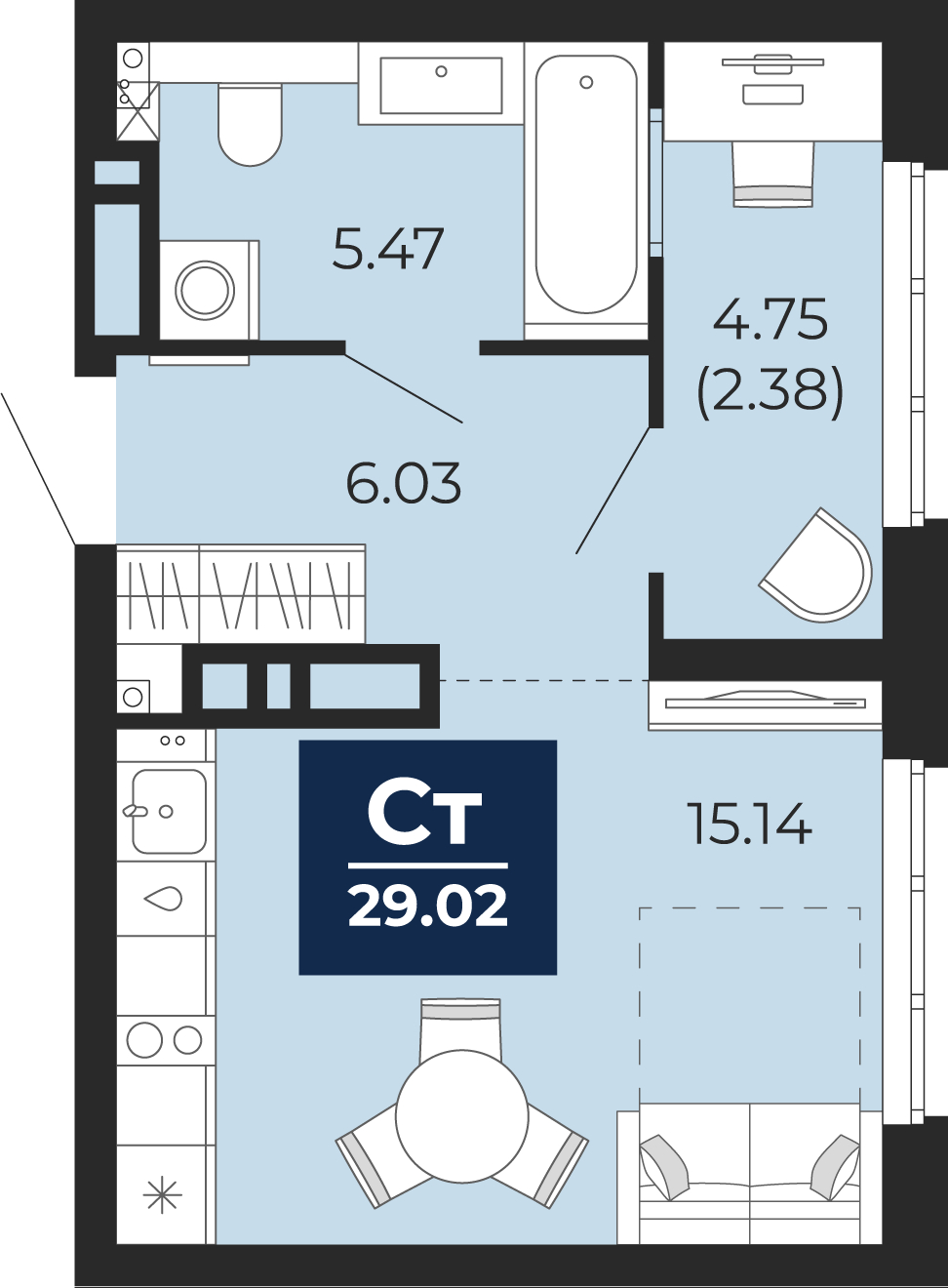 • До передачи квартиры собственнику в ней выполняются все капитальные и грязные работы. Стены подготавливаются под оклейку обоями. На полу выполняется полусухая стяжка со звукоизолирующим слоем. Водопровод и канализация заводятся в помещение с установкой заглушек, подводка до сантехнического оборудования не выполняется, устанавливаются счётчики воды.