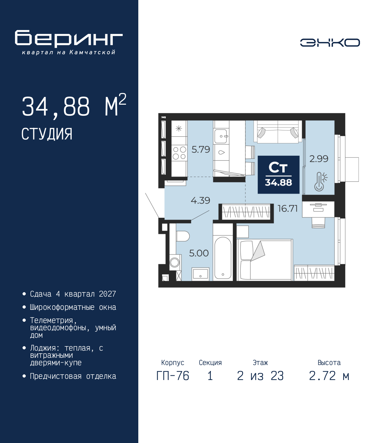 • Предусмотрен расширенный пакет системы Умный Дом: бесключевой доступ в подъезд, видеодомофон с функцией Face ID, видеонаблюдение, автоматизированный сбор и передача показаний счётчиков.