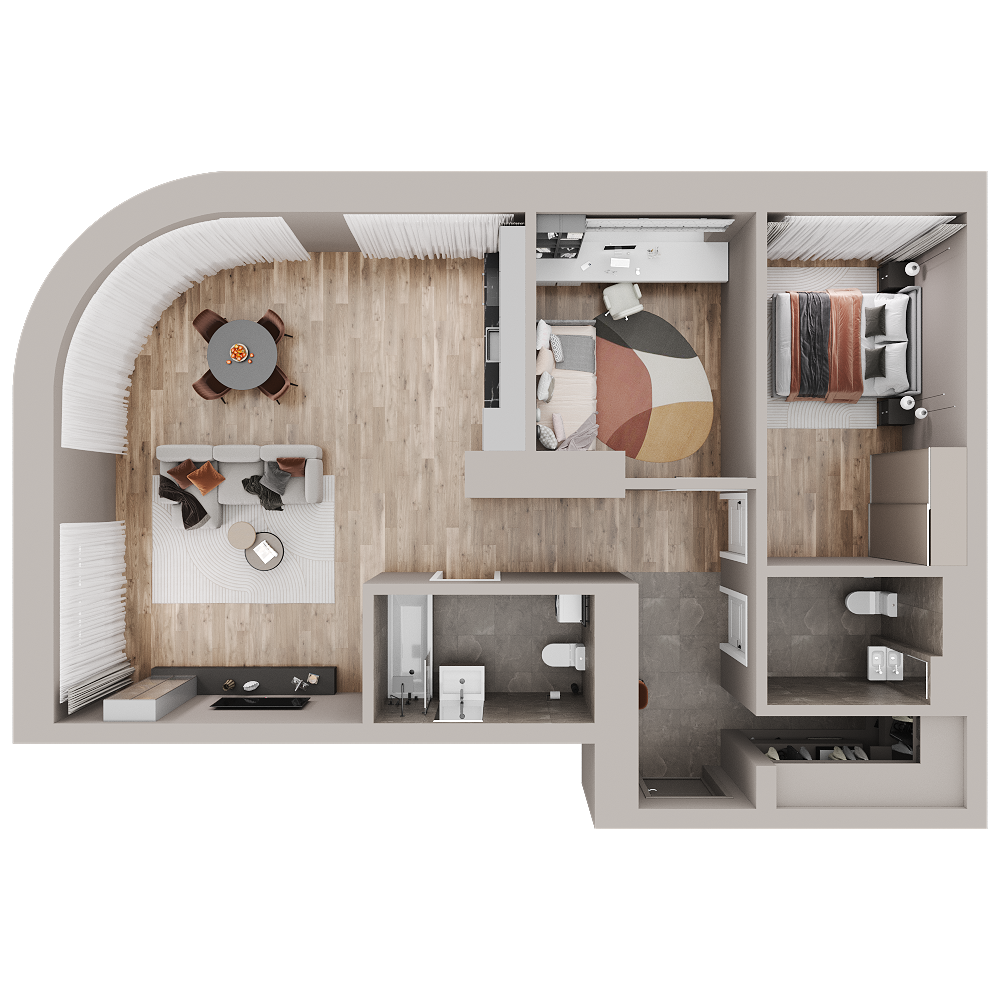 Квартира передаётся будущему собственнику со свободной планировкой. Внутриквартирные перегородки из кирпича и керамзитобетонных блоков выполняются только для санузлов. Благодаря высоким потолкам, большим окнам и увеличенным пролетам между несущими конструкциями здания, в своей квартире вы сможете реализовать практически любой дизайн-проект.