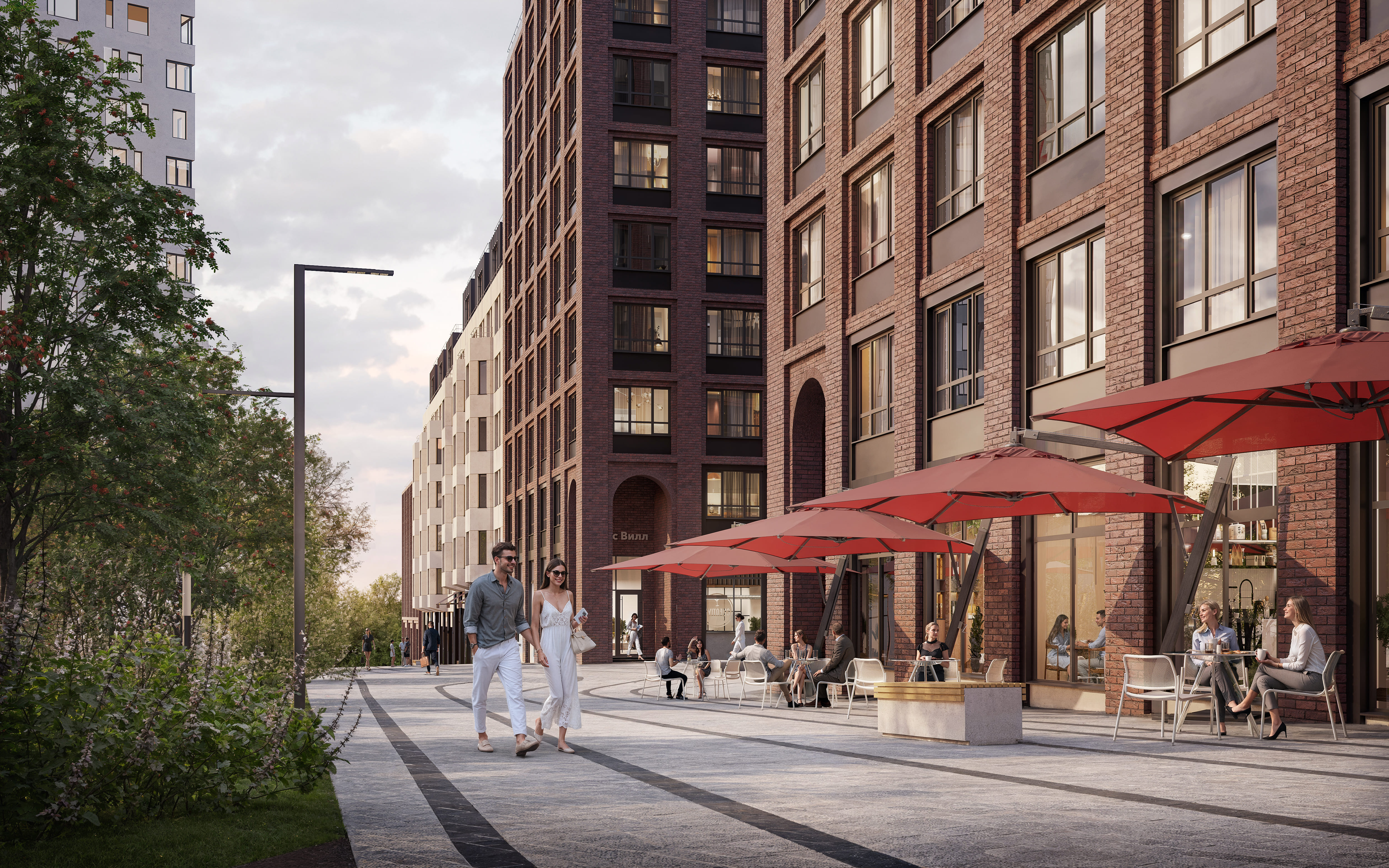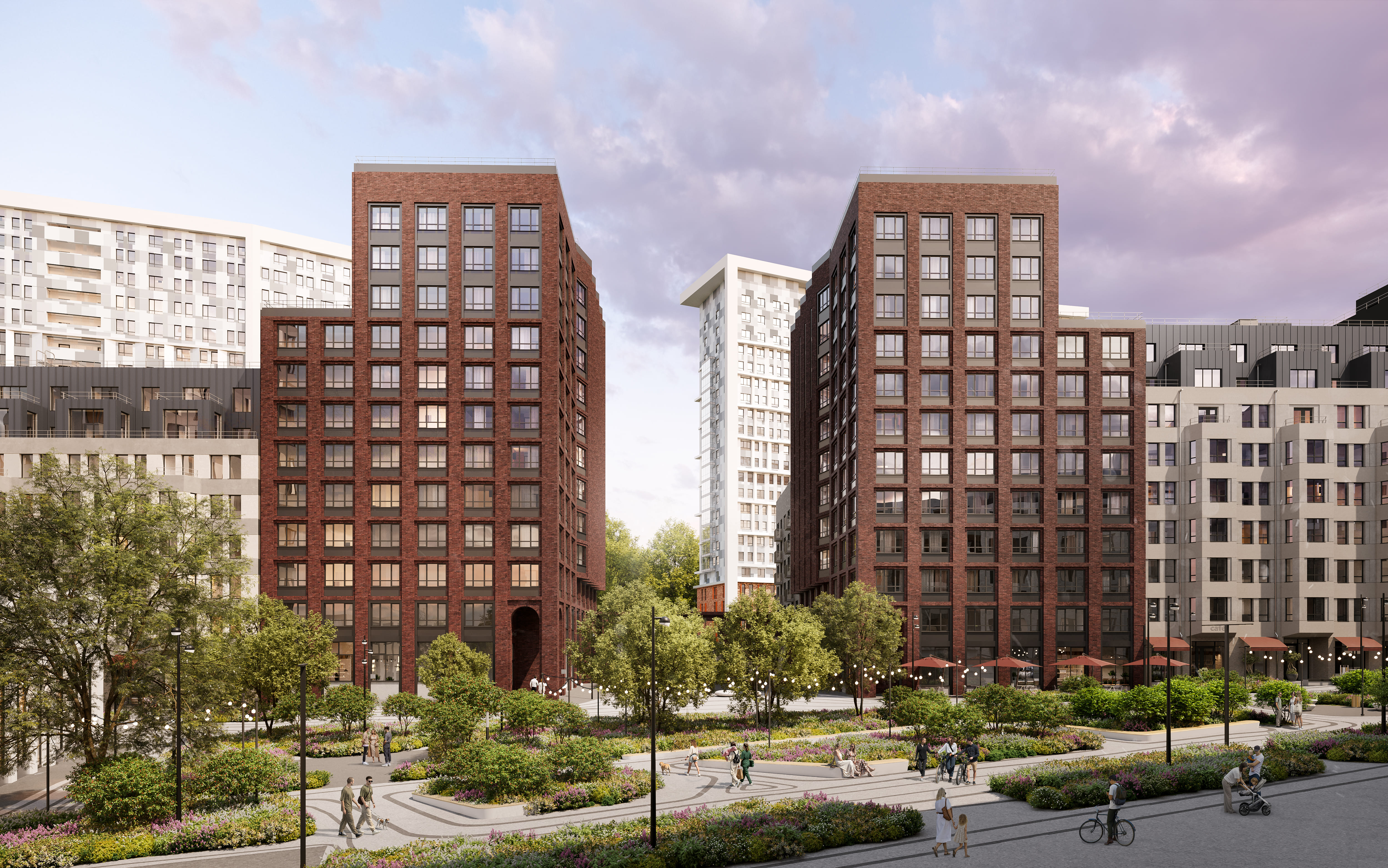 Здания комплекса примыкают друг другу торцами и создают единую архитектурную форму. Дома по обе стороны бульвара задают направление для прогулок, а волнообразный рисунок брусчатки и плавные изгибы делают бульвар похожим на русло реки. Каждый дом комплекса отличается от другого этажностью, формой, цветом, геометрией фасада.