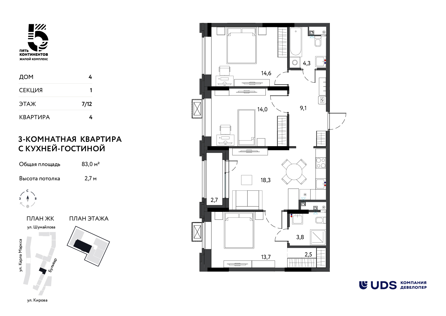 Купить 4к квартиру 83 м² в ЖК Пять континентов